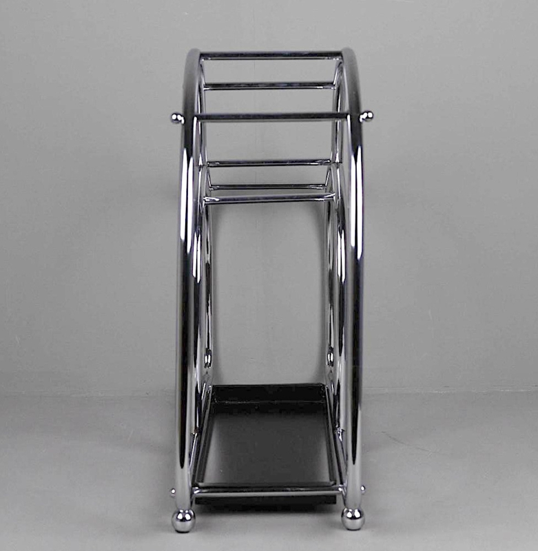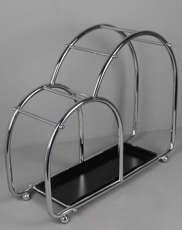 Deze paraplubak heeft een verchroomd frame met bolpootjes en een uitneembare lekbak van zwart gelakt metaal.