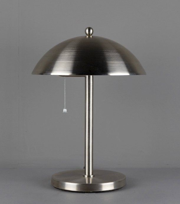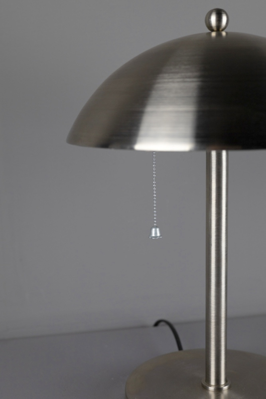 Mooie tafellamp met trekschakelaar, geheel in mat nikkel uitgevoerd.