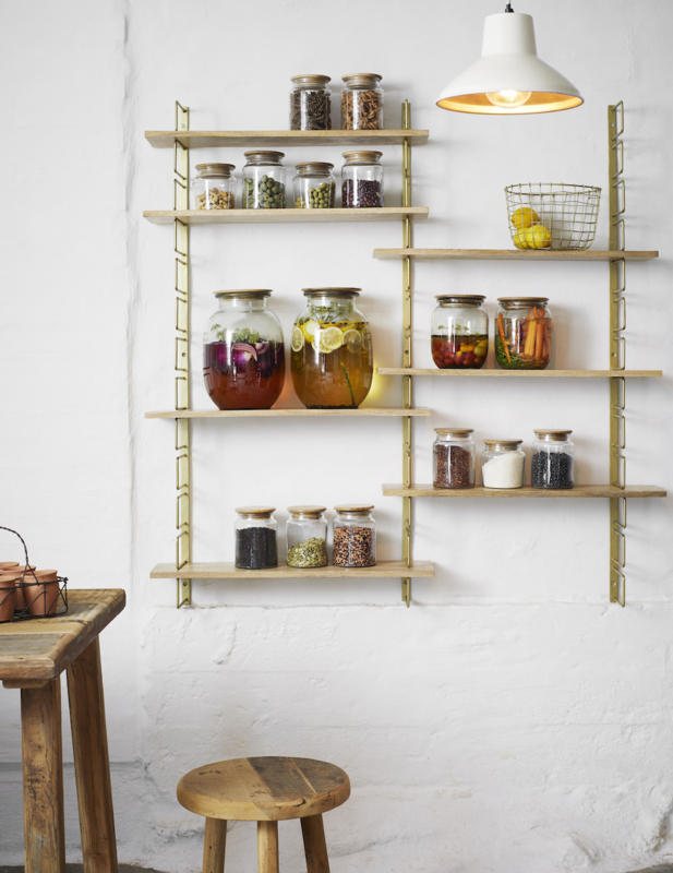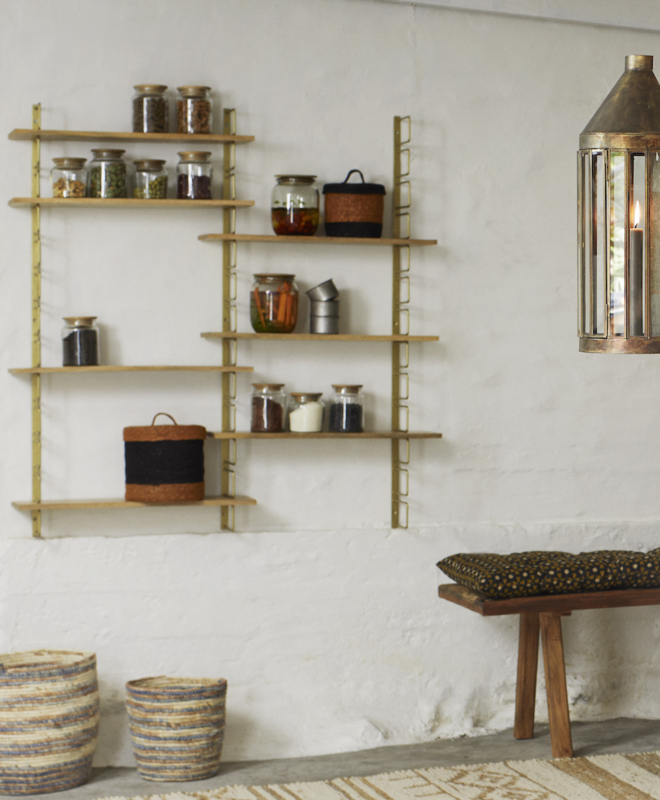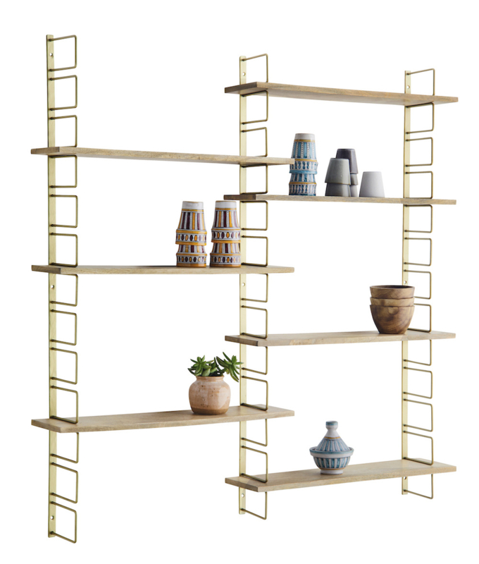 Stijlvol en stoer wandrek in antiek messing met in hoogte verstelbare houten planken.